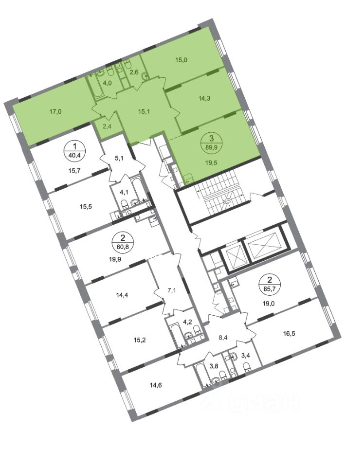 Общая площадь квартиры - 89,9 кв. м, этаж 8 из 17.