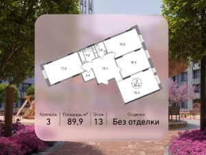 Общая площадь квартиры - 89,9 кв. м, этаж 13 из 17.