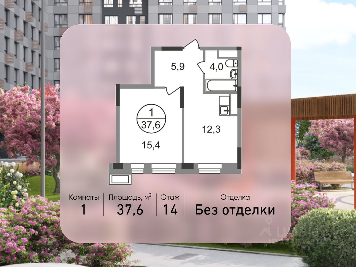Общая площадь квартиры - 37,6 кв. м, этаж 14 из 19.