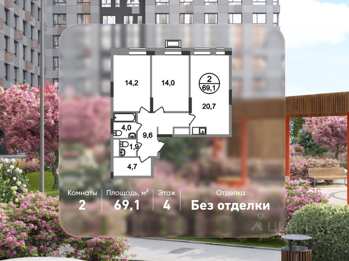 Общая площадь квартиры - 69,1 кв. м, этаж 4 из 19.