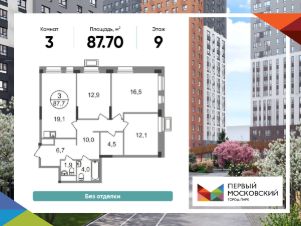 Общая площадь квартиры - 87,7 кв. м, этаж 9 из 19.