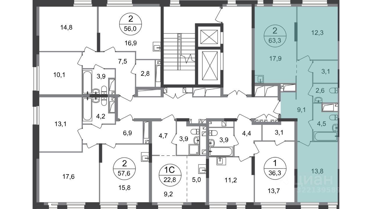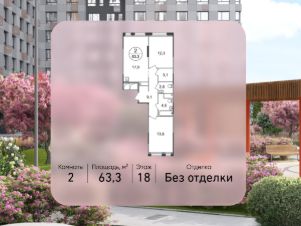 Общая площадь квартиры - 63,3 кв. м, этаж 18 из 19.