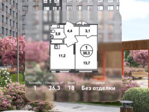 Общая площадь квартиры - 36,3 кв. м, этаж 18 из 19.