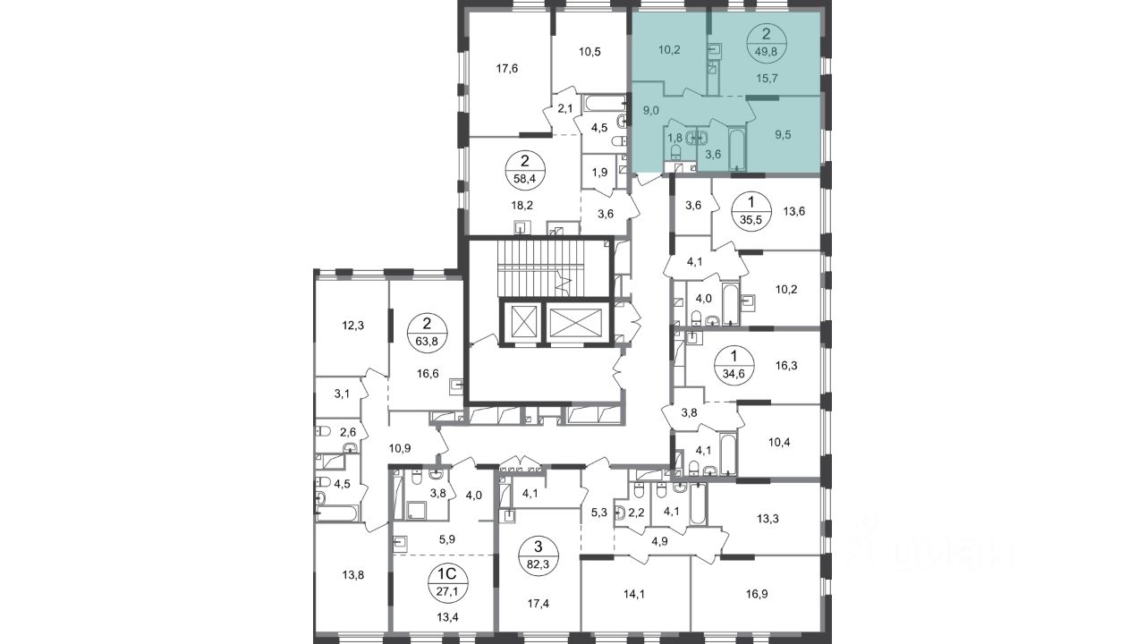 Общая площадь квартиры - 49,8 кв. м, этаж 9 из 19.