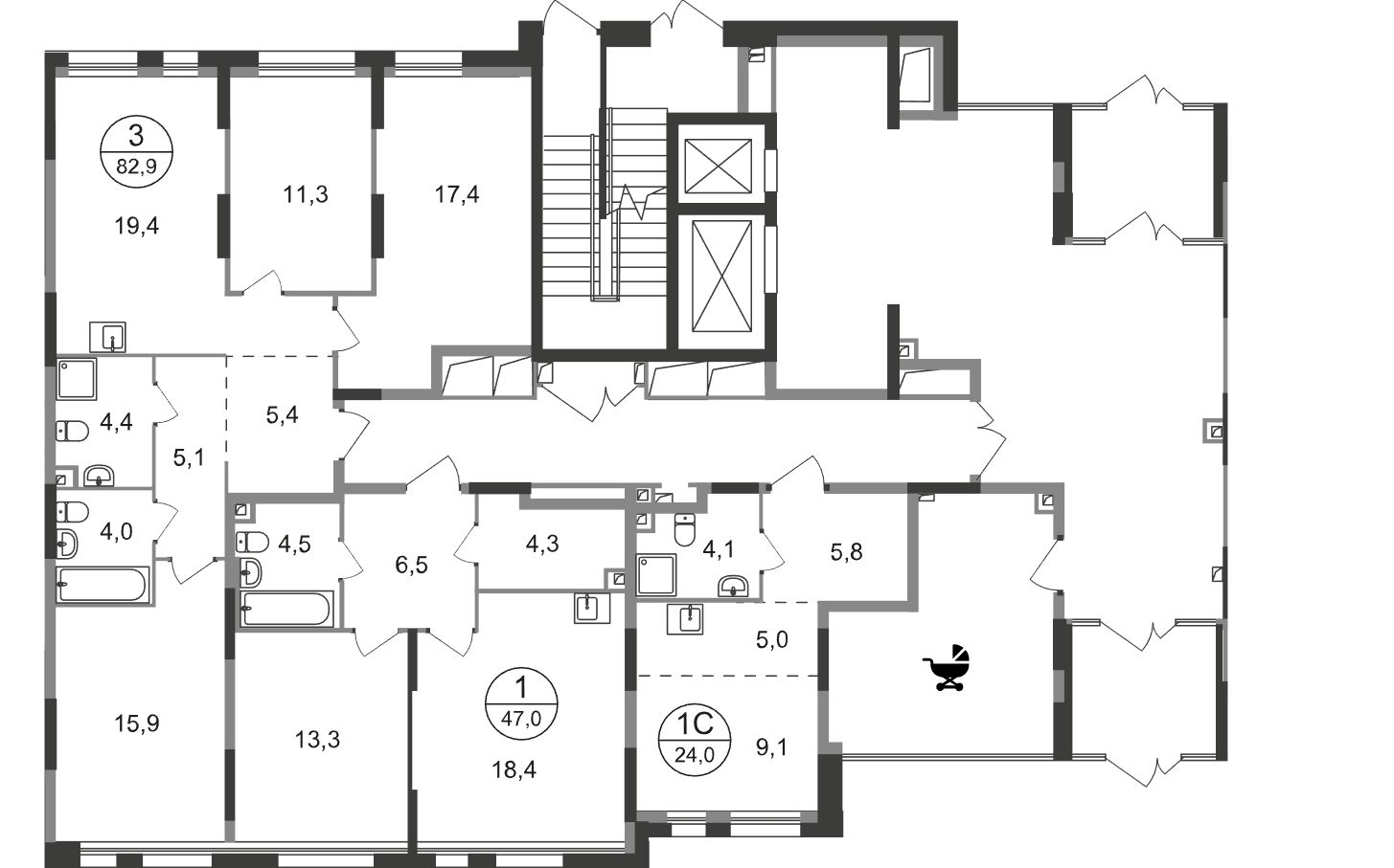 - Smart+ (современный стиль) - нейтральная цветовая гамма с использованием бетонных фактур и темного керамогранита, керамическая плитка до потолка в ванной и санузле.