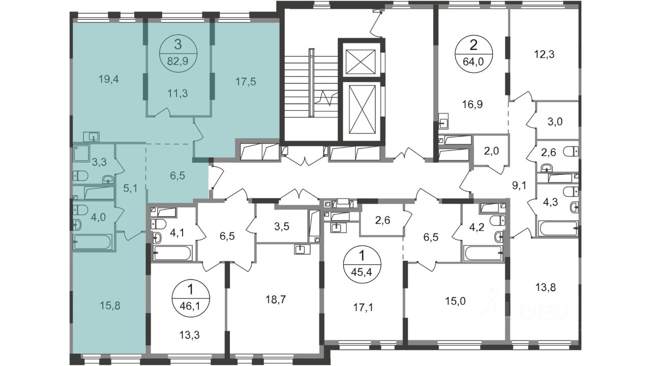 Общая площадь квартиры - 82,9 кв. м, этаж 11 из 19.