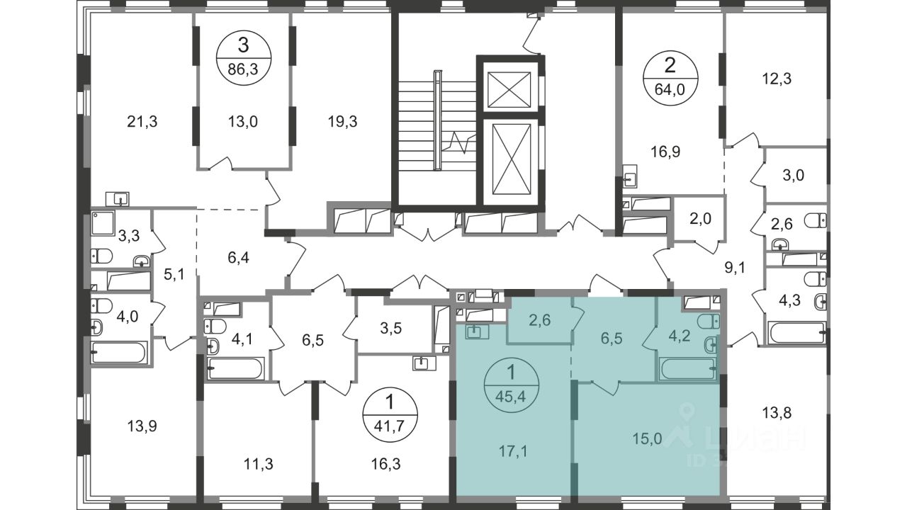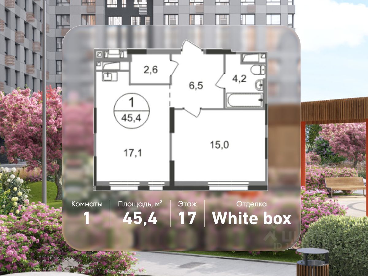 Общая площадь квартиры - 45,4 кв. м, этаж 17 из 19.