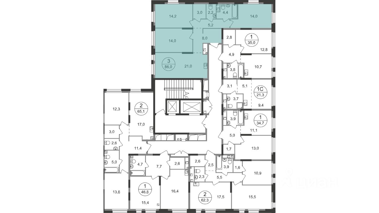 Общая площадь квартиры - 86 кв. м, этаж 2 из 19.