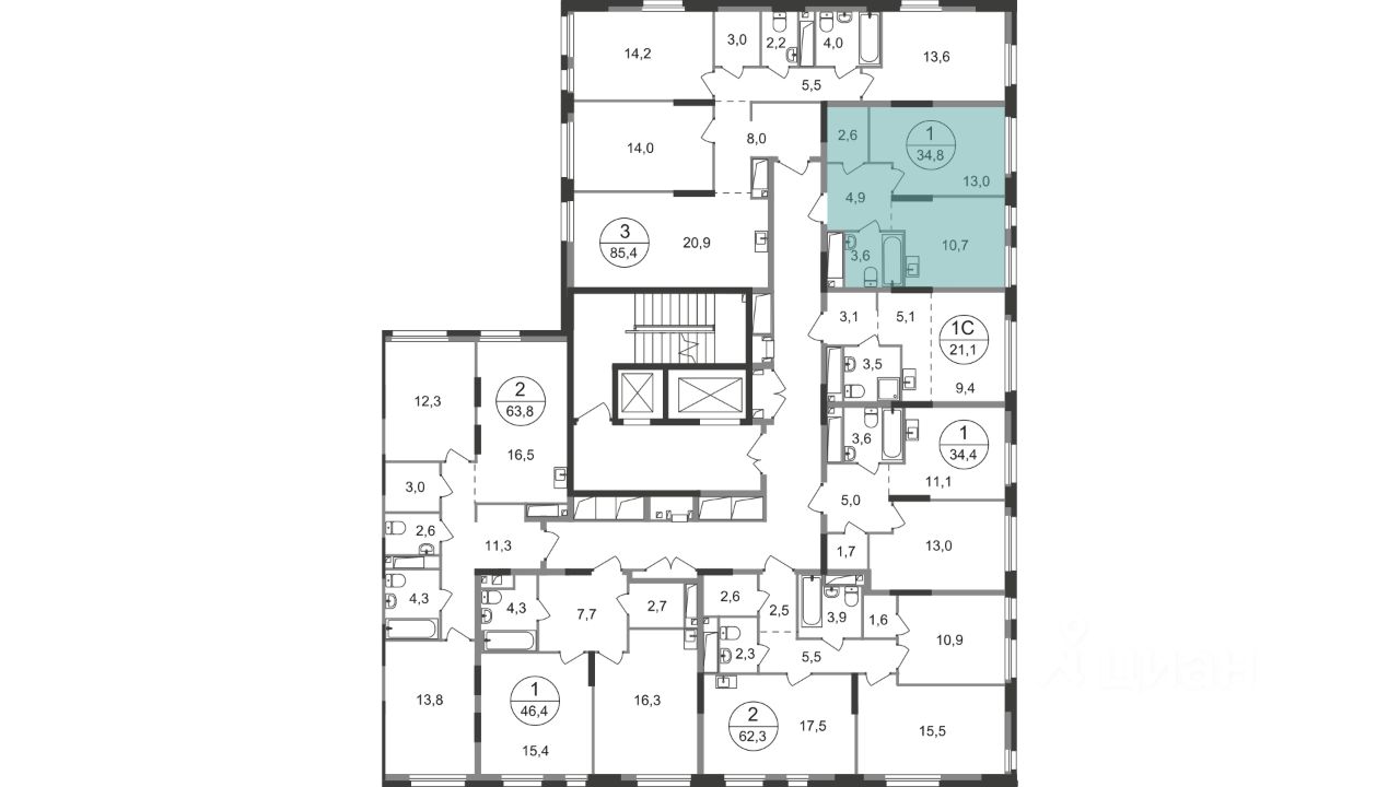 Общая площадь квартиры - 34,8 кв. м, этаж 17 из 19.