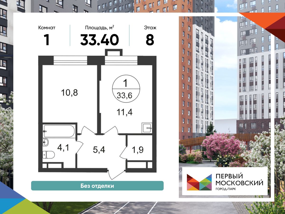 Общая площадь квартиры - 33,4 кв. м, этаж - 8 из 20.