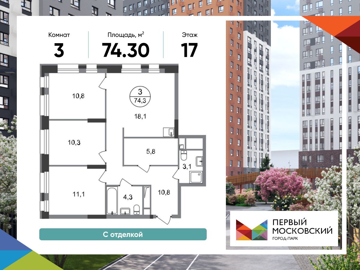 Общая площадь квартиры - 74,3 кв. м, этаж 17 из 20.