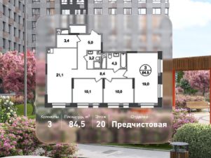 Общая площадь квартиры - 84,5 кв. м, этаж 20 из 20.
