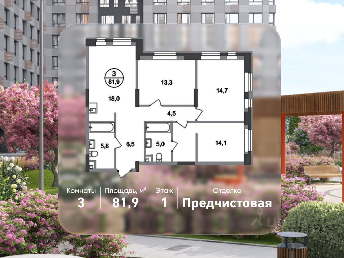 Общая площадь квартиры - 81,9 кв. м, этаж 1 из 20.
