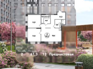 Общая площадь квартиры - 61,3 кв. м, этаж 13 из 20.