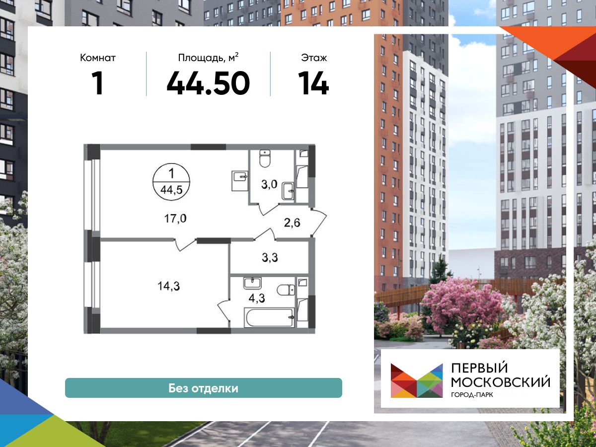 Общая площадь квартиры - 44,5 кв. м, этаж 14 из 20.