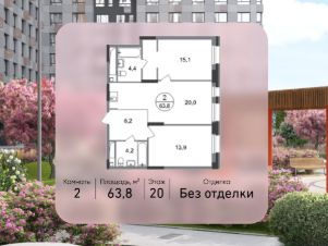 Общая площадь квартиры - 63,8 кв. м, этаж 20 из 20.