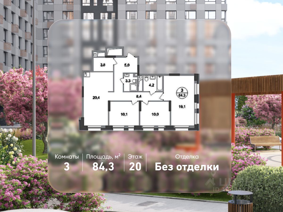 Общая площадь квартиры - 84,3 кв. м, этаж 20 из 20.