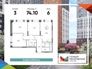 Общая площадь квартиры - 74,1 кв. м, этаж 6 из 19.