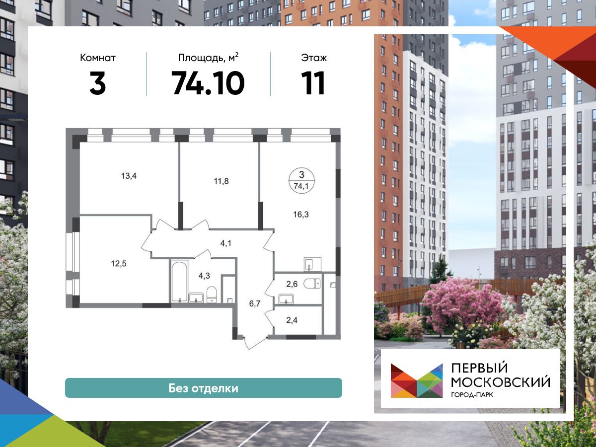 Продается трехкомнатная квартира без отделки в 9 фазе города-парка "Первый Московский".