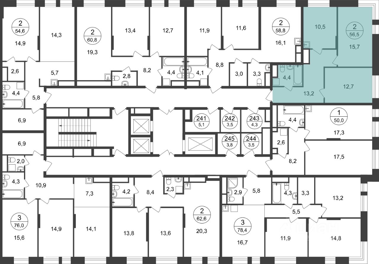 Общая площадь квартиры - 56,5 кв. м, этаж - 11 из 22.