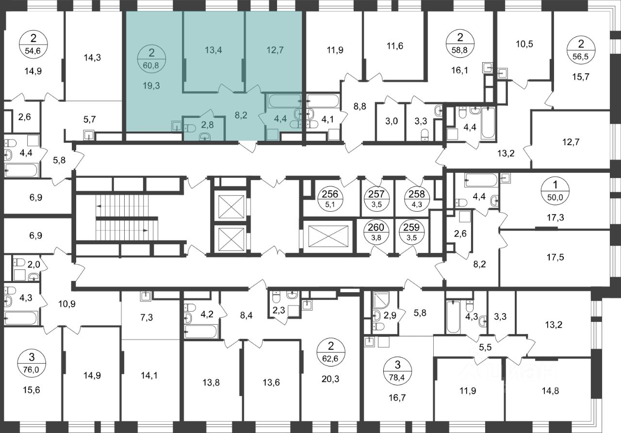 Общая площадь квартиры - 60,8 кв. м, этаж - 14 из 22.