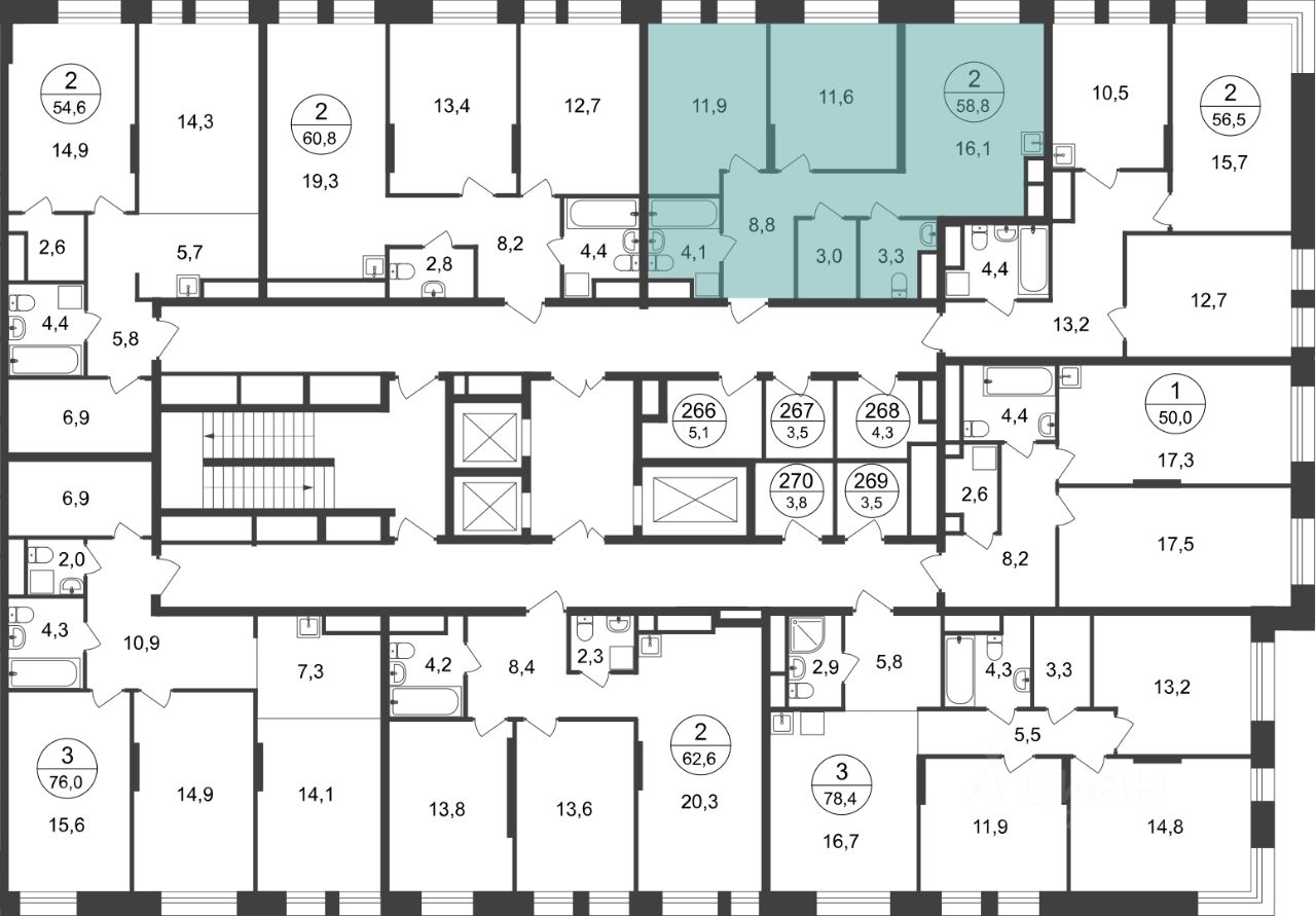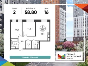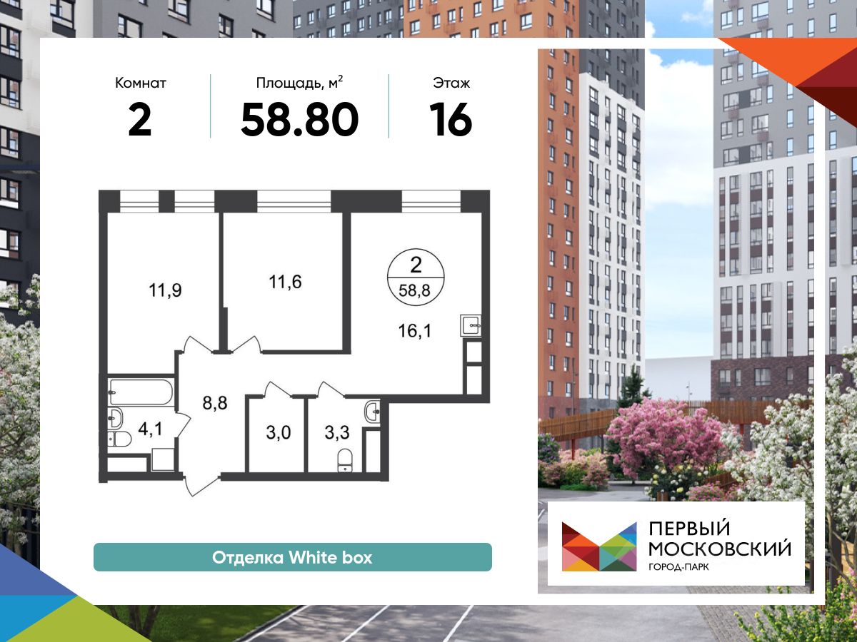 Общая площадь квартиры - 58,8 кв. м, этаж - 16 из 22.