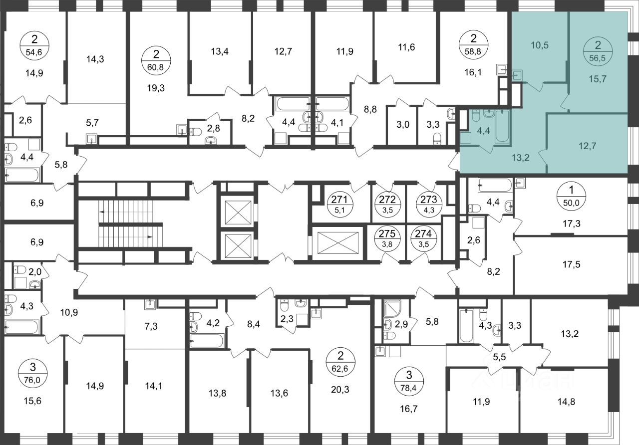 Общая площадь квартиры - 56,5 кв. м, этаж - 17 из 22.
