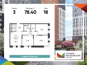Общая площадь квартиры - 78,4 кв. м, этаж - 18 из 22.