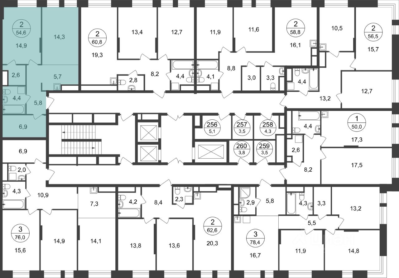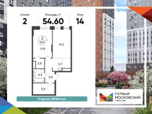 Общая площадь квартиры - 54,6 кв. м, этаж - 14 из 22.