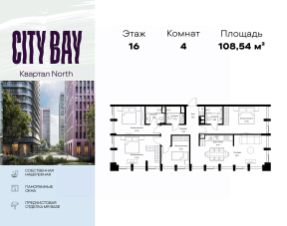 Продаётся 4-комнатная квартира общей площадью 108.54 м² с предчистовой отделкой в ЖК City Вау, квартале North, на 16-м этаже 17 этажного дома.