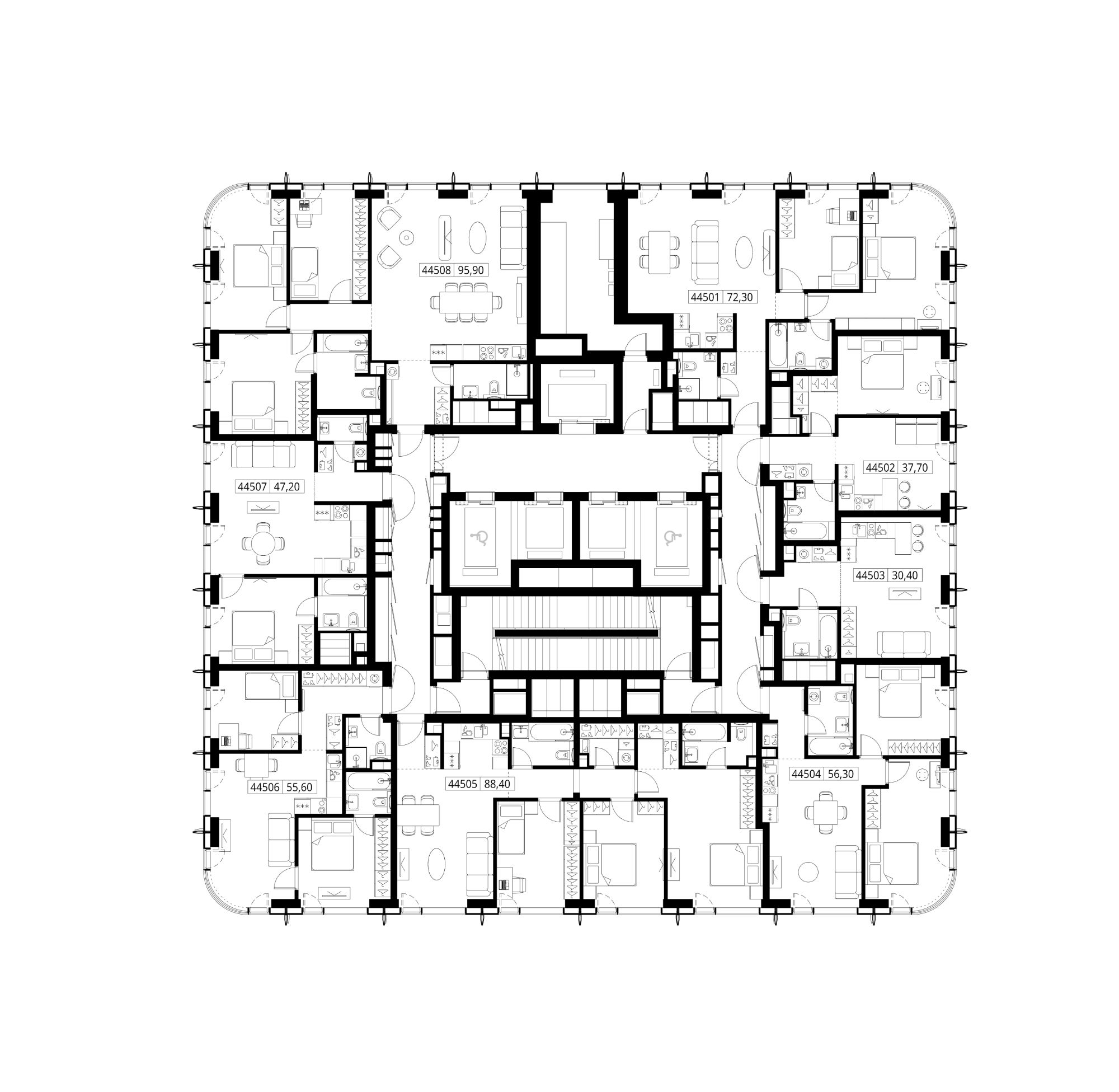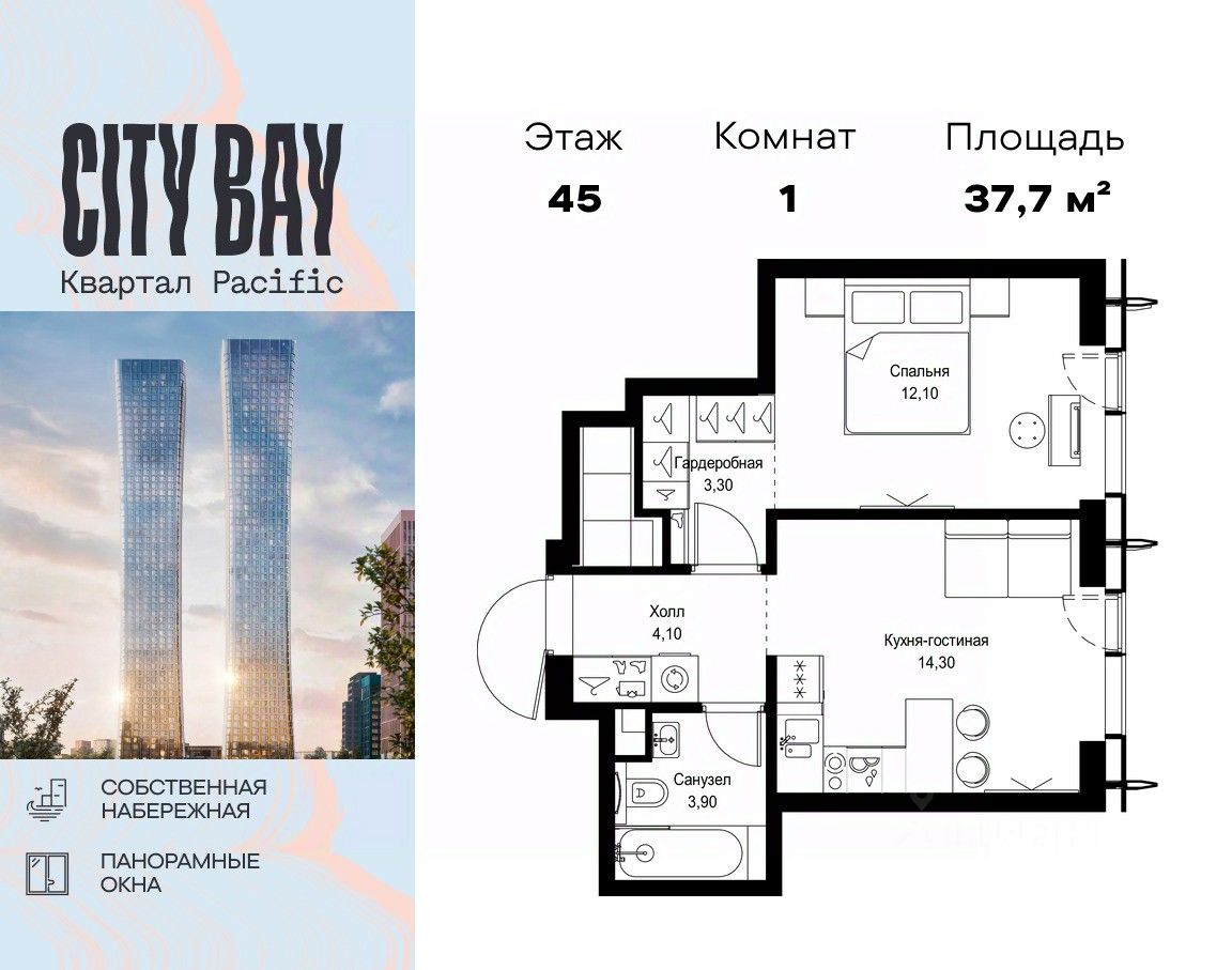 Продаётся 1-комнатная квартира общей площадью 37.70 м² без отделки в ЖК City Вау, квартале Pacific, на 45-м этаже 47 этажного дома.