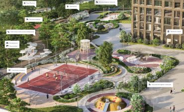 Зарытая территория дома c ландшафтным дизайном и разнообразными площадками для отдыха, спорта и зонами игр для детей. На первых этажах зданий расположатся объекты инфраструктуры: кафе, рестораны, магазины, пункты выдачи маркетплейсов и т.д.