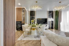 Евро-4, 93,6 м², высокий 20 этаж. Лучшая планировка комплекса: окна на две стороны, просторные комнаты, три спальни, полноценный master-блок, кухня-гостиная 28 м² с камином, два санузла и две гардеробные.
