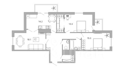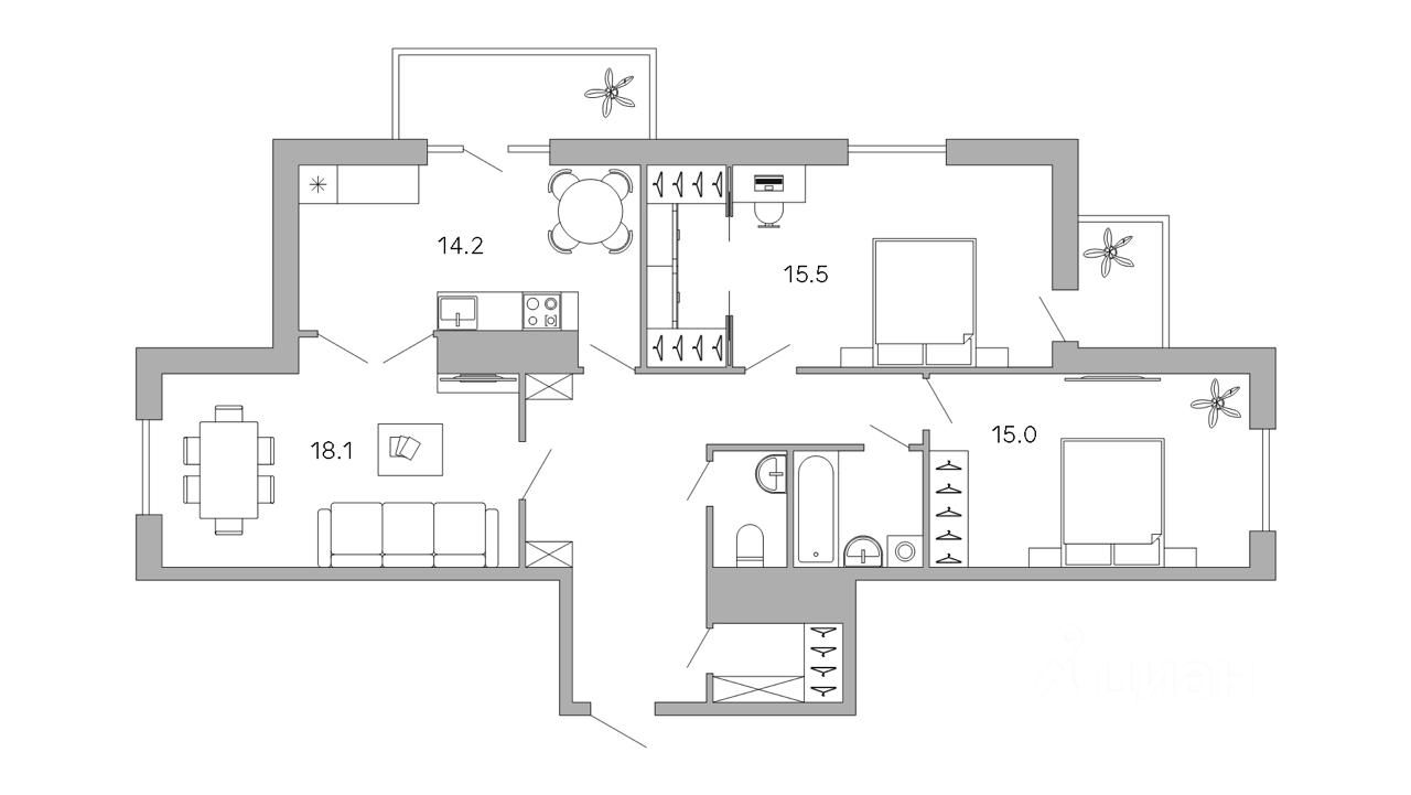 — Три изолированные комнаты (15 м2, 15,5 м2 и 16,5 м2): можно сделать спальни, детскую, рабочий кабинет