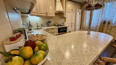 На 4 этаже 12-этажного монолитного дома продается просторная евро-трёшка 82 кв.м. с дизайнерским ремонтом и продуманной планировкой. Интерьер выполнен в светлых бежевых тонах с акцентами венге, что создаёт гармоничное и респектабельное пространство.
