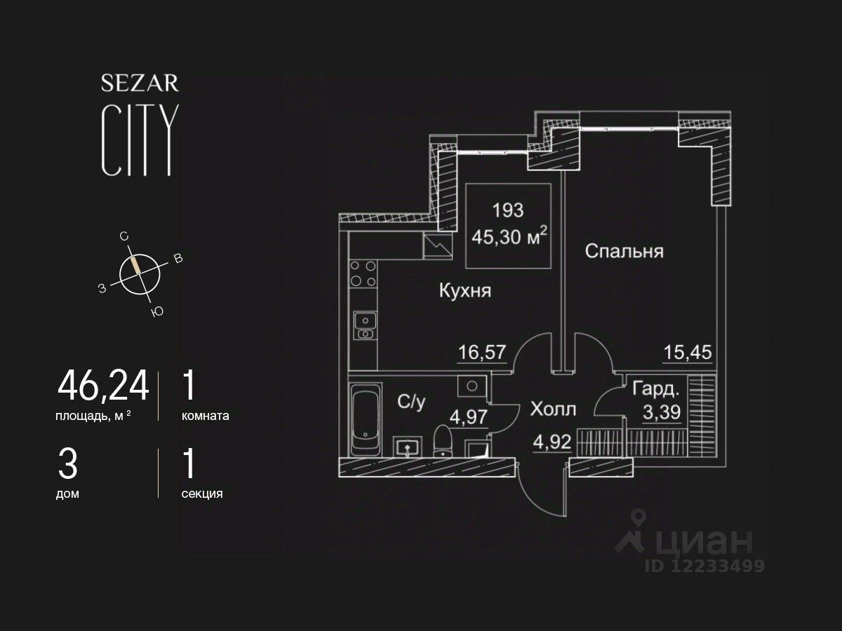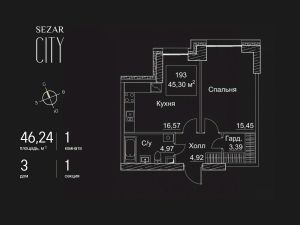 Продается 1-комнатная квартира в ЖК SEZAR CITY на 19 этаже. Общая площадь квартиры составляет 46,24 кв.м. Квартира без отделки. Срок сдачи - 2027 год.