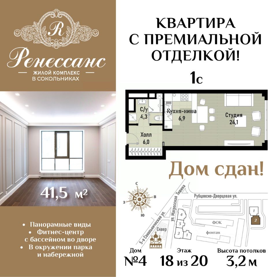 Жилой комплекс премиум-класса "Ренессанс" расположен на Рубцовско-Дворцовой улице исторического района Сокольники, в неск. мин. ходьбы от знаменитого парка "Сокольники", где круглый год можно прекрасно проводить время всей семьей. Квартиры продаются с полной отделкой, что обеспечивает комфорт проживания в доме сразу после получения ключей, т.к. исключает длительный период ремонта квартир - у вас и соседей, а также сохраняет презентабельные входные группы в идеальном состоянии. Премиальная отделка квартир "под ключ" выполнена европейскими специалистами по эксклюзивным дизайн-проектам с использованием дорогих материалов: экологичное напольное покрытие - инженерная доска TRIO на хвое (материал - дуб) и керамогранит KERAMA MARAZZI с обогревом пола, стяжка пола с шумоизоляцией, современные системы кондиционирования и сантехническое оборудование премиум-класса - Villeroy Boch, Grohe, Geberit Duofix, выключатели и розетки - Berker. Высокие потолки - 3,2 м и входные двери квартир - 2,4 м со вставками из массива дуба, выполненные в едином стиле, подчеркивают премиальный статус владельцев. Из панорамных окон премиального бренда Schuco открываются завораживающие виды на сияющие в лучах солнца купола церквей и храмов, зелень легендарного парка "Сокольники" и национального парка "Лосиный остров", излучины реки Яузы с величественной гранитной набережной, старинные здания, среди которых дворец императрицы Елизаветы Петровны, небоскребы "Москва-Сити", Останкинскую телебашню и приватную, охраняемую территорию комплекса с концепцией "двор без машин", изысканным ландшафтным дизайном, богатой коллекцией растений, пространствами для отдыха с роскошным фонтаном с красивой подсветкой, элегантной перголой, большими шахматами, детскими городками и спортивными площадками. Роскошный интерьер лобби: натуральный испанский мрамор, вертикальный фонтан, репродукции картин эпохи Возрождения, великолепная итальянская люстра ручной работы с подвесками из хрусталя CutCrystal и муранского стекла, иранские ковры, дизайнерская мебель. Лифты премиум-класса ThyssenKrupp. Консьерж-сервис. На этажах мусорокамеры закрытого типа. Из квартиры можно связаться с консьержем по видеодомофону британской компании BAS-IP. Уникальная транспортная доступность: 5 мин. на авто до ТТК и Русаковской эстакады, 10 мин. - до Садового кольца и ул. Земляной Вал, 15 мин. - до Кремлевской наб. В шаговой доступности - ст. м. и БКЛ "Сокольники" и "Электрозаводская". Развитая собственная инфраструктура: подземный паркинг, здание фитнес-центра с бассейнами, объекты торговли и сферы услуг. Отличная инфраструктура респектабельного района Сокольники: детсады, элитные общеобразовательные, музыкальные и спортивные школы, ТЦ и т.д.