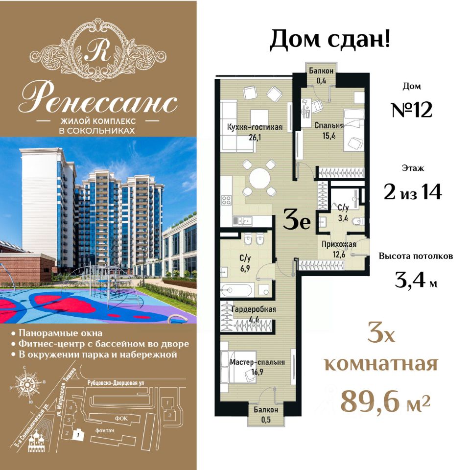 Жилой комплекс премиум-класса "Ренессанс" расположен на Рубцовско-Дворцовой улице старинного района Сокольники, в нескольких минутах ходьбы от знаменитого парка "Сокольники" - самого большого парка Москвы и одного из крупнейших в Европе, где круглый год можно прекрасно проводить время всей семьей. Из панорамных окон премиального бренда Schuco открываются завораживающие виды на сияющие в лучах солнца купола церквей и храмов, изумрудную зелень легендарного парка "Сокольники" и национального парка "Лосиный остров", излучины реки Яузы с величественной гранитной набережной, старинные здания, среди которых дворец императрицы Елизаветы Петровны, небоскребы "Москва-Сити", Останкинскую телебашню и приватную, охраняемую территорию комплекса с концепцией "двор без машин", изысканным ландшафтным дизайном, богатой коллекцией растений, пространствами для отдыха с роскошным фонтаном с красивой подсветкой, элегантной перголой, большими шахматами, детскими городками и спортивными площадками. Роскошный интерьер лобби: натуральный испанский мрамор, вертикальный фонтан, репродукции картин эпохи Возрождения, великолепная итальянская люстра ручной работы с подвесками из хрусталя CutCrystal и муранского стекла, иранские ковры и дизайнерская мебель. Лифты премиум-класса ThyssenKrupp. Консьерж-сервис. На этажах мусорокамеры закрытого типа. Из квартиры можно связаться с консьержем по видеодомофону британской компании BAS-IP. Уникальная транспортная доступность: 5 мин. на авто - до ТТК и Русаковской эстакады; 10 мин. - до Садового кольца и улицы Земляной Вал; 15 мин. - до Кремлевской набережной. В шаговой доступности - ст. м. и БКЛ "Сокольники" и "Электрозаводская". Развитая собственная инфраструктура: подземный паркинг, здание фитнес-центра с бассейнами, объекты торговли и сферы услуг. Отличная инфраструктура респектабельного района Сокольники: детские сады, элитные общеобразовательные, музыкальные и спортивные школы, ТЦ, рестораны, банки.