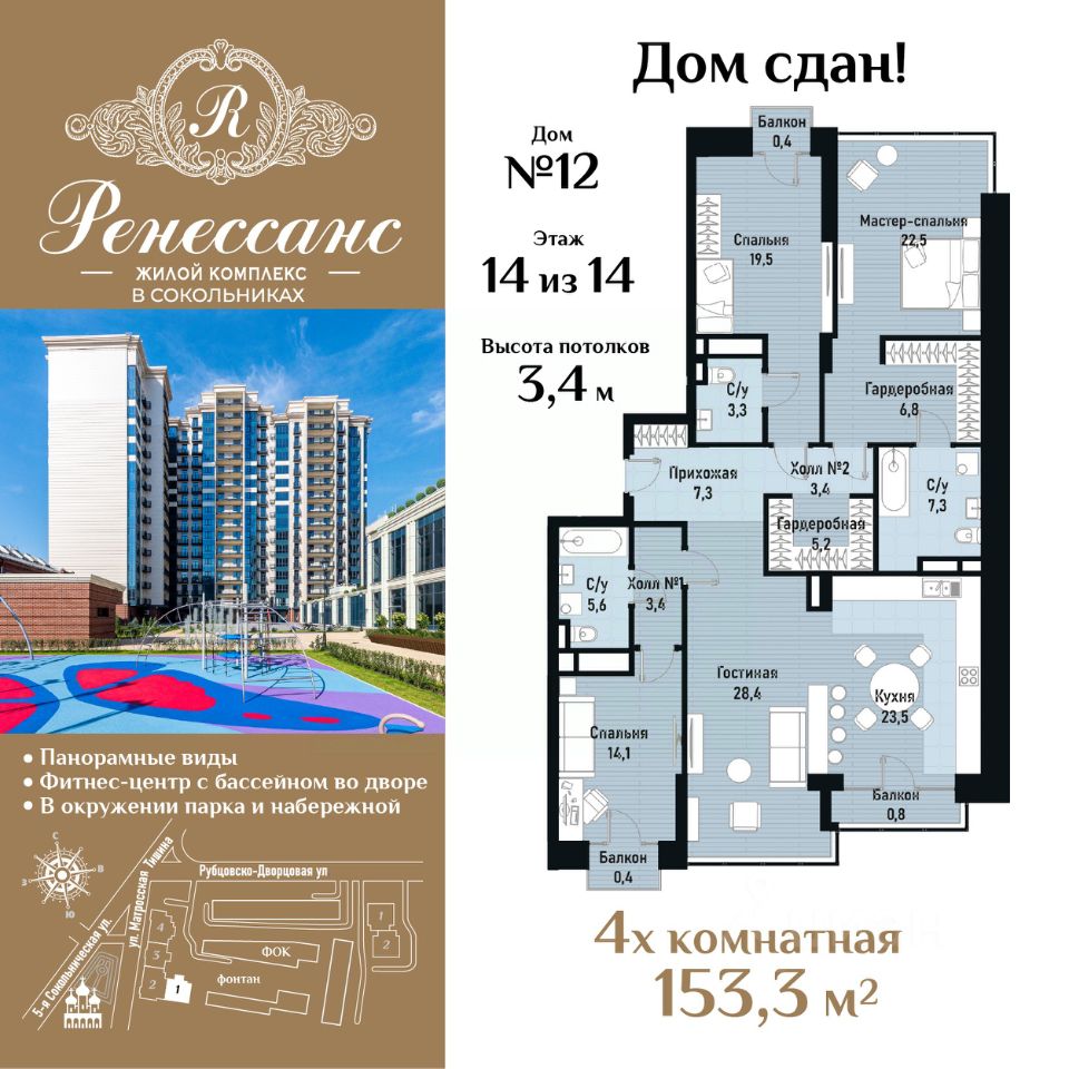 Жилой комплекс премиум-класса "Ренессанс" расположен на Рубцовско-Дворцовой улице старинного района Сокольники, в нескольких минутах ходьбы от знаменитого парка "Сокольники" - самого большого парка Москвы и одного из крупнейших в Европе, где круглый год можно прекрасно проводить время всей семьей. Из панорамных окон премиального бренда Schuco открываются завораживающие виды на сияющие в лучах солнца купола церквей и храмов, изумрудную зелень легендарного парка "Сокольники" и национального парка "Лосиный остров", излучины реки Яузы с величественной гранитной набережной, старинные здания, среди которых дворец императрицы Елизаветы Петровны, небоскребы "Москва-Сити", Останкинскую телебашню и приватную, охраняемую территорию комплекса с концепцией "двор без машин", изысканным ландшафтным дизайном, богатой коллекцией растений, пространствами для отдыха с роскошным фонтаном с красивой подсветкой, элегантной перголой, большими шахматами, детскими городками и спортивными площадками. Роскошный интерьер лобби: натуральный испанский мрамор, вертикальный фонтан, репродукции картин эпохи Возрождения, великолепная итальянская люстра ручной работы с подвесками из хрусталя CutCrystal и муранского стекла, иранские ковры и дизайнерская мебель. Лифты премиум-класса ThyssenKrupp. Консьерж-сервис. На этажах мусорокамеры закрытого типа. Из квартиры можно связаться с консьержем по видеодомофону британской компании BAS-IP. Уникальная транспортная доступность: 5 мин. на авто - до ТТК и Русаковской эстакады; 10 мин. - до Садового кольца и улицы Земляной Вал; 15 мин. - до Кремлевской набережной. В шаговой доступности - ст. м. и БКЛ "Сокольники" и "Электрозаводская". Развитая собственная инфраструктура: подземный паркинг, здание фитнес-центра с бассейнами, объекты торговли и сферы услуг. Отличная инфраструктура респектабельного района Сокольники: детские сады, элитные общеобразовательные, музыкальные и спортивные школы, ТЦ, рестораны, банки.
