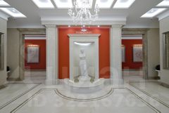 Роскошный интерьер лобби: натуральный испанский мрамор, вертикальный фонтан, репродукции картин эпохи Возрождения, великолепная итальянская люстра ручной работы с подвесками из хрусталя CutCrystal и муранского стекла, иранские ковры и дизайнерская мебель. Лифты премиум-класса ThyssenKrupp.