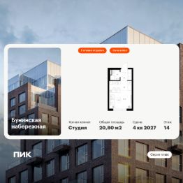 Продаётся квартира-студия площадью 20,8 кв.м на 14 этаже 16 этажного дома (Корпус 2.6/1.3, Секция 3) проекта ПИК Бунинская набережная. Светлый просторный подъезд на уровне земли, функциональная планировка, большие окна, c отделкой.