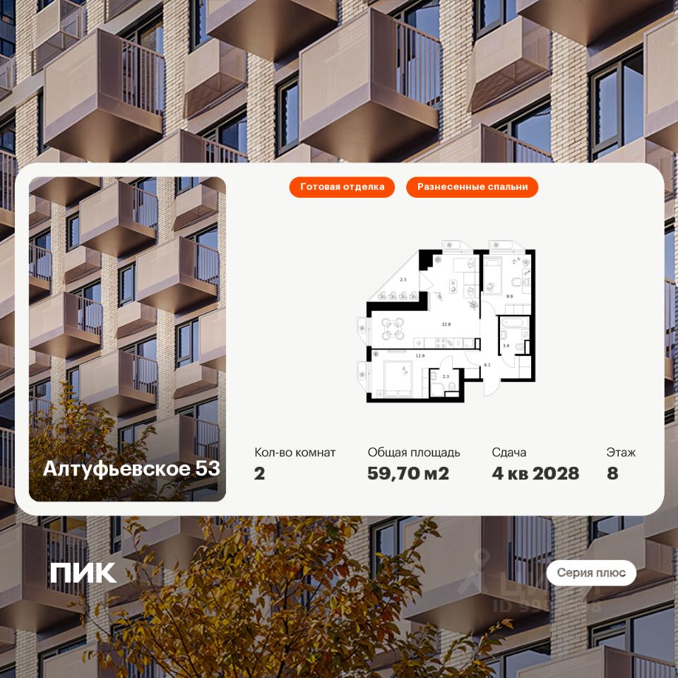 Продаётся 2-комн. квартира площадью 59,7 кв.м на 8 этаже 32 этажного дома (Корпус 1.1, Секция 2) проекта ПИК Алтуфьевское 53. Светлый просторный подъезд на уровне земли, функциональная планировка, большие окна, c отделкой.