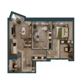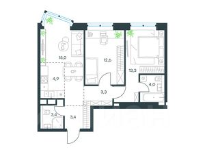 Зонирование: кухня-гостиная, две изолированные спальни, два совмещенных санузла.