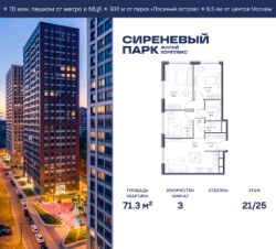 Продаётся просторная 3-комнатная квартира общей площадью 71.3 м² на 21 этаже в новом жилом комплексе "Сиреневый парк", расположенном в Восточном административном округе Москвы на улице Тагильская. Всего 10 минут ходьбы от станции метро "Бульвар Рокоссовского" и одноимённой платформы МЦК.