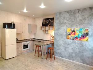 В жилом пространстве студии расположилась удобная кухня, укомплектованная всем необходимым, есть барная зона;