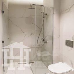 Санузел оборудован душевой с тропическим душем, который позволит вам расслабиться и насладиться водными процедурами.