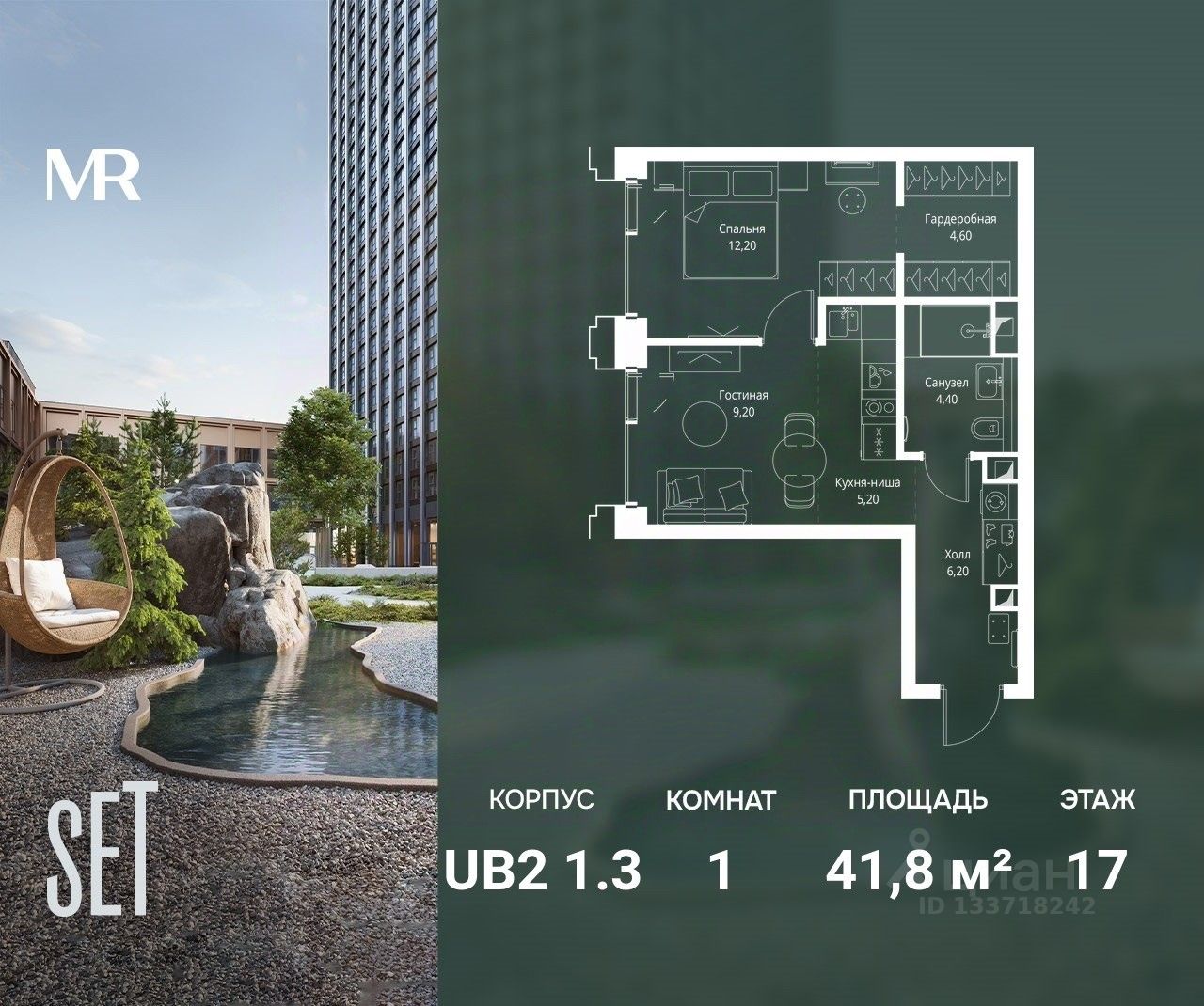 В ЖК SET продается 1-к квартира площадью 41.80 м², расположенная в корпусе 3, на 17 этаже 45 этажного дома.