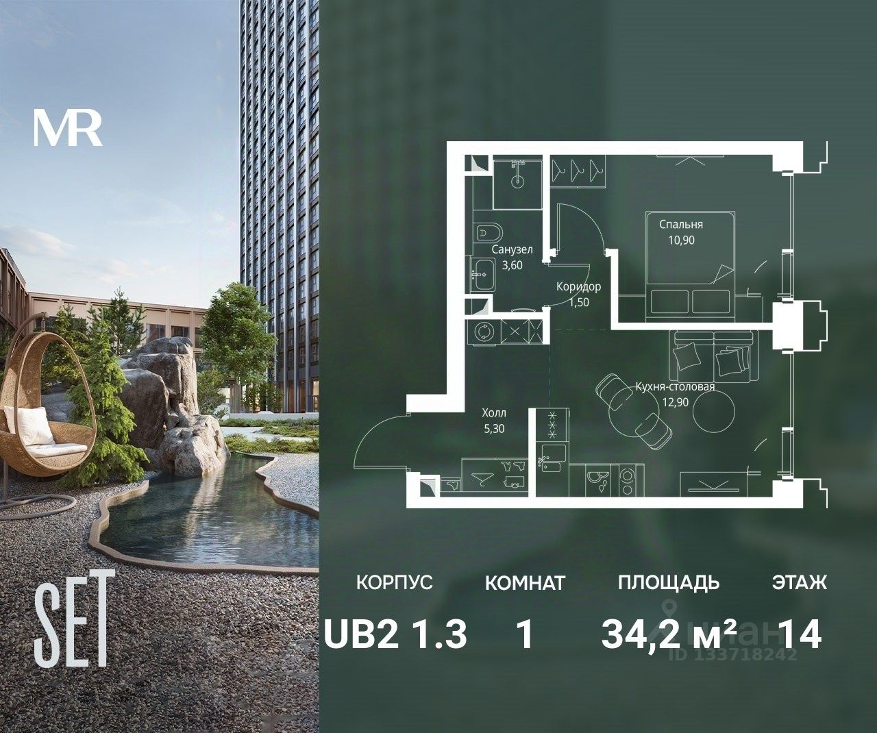 В ЖК SET продается 1-к квартира площадью 34.20 м², расположенная в корпусе 3, на 14 этаже 45 этажного дома.