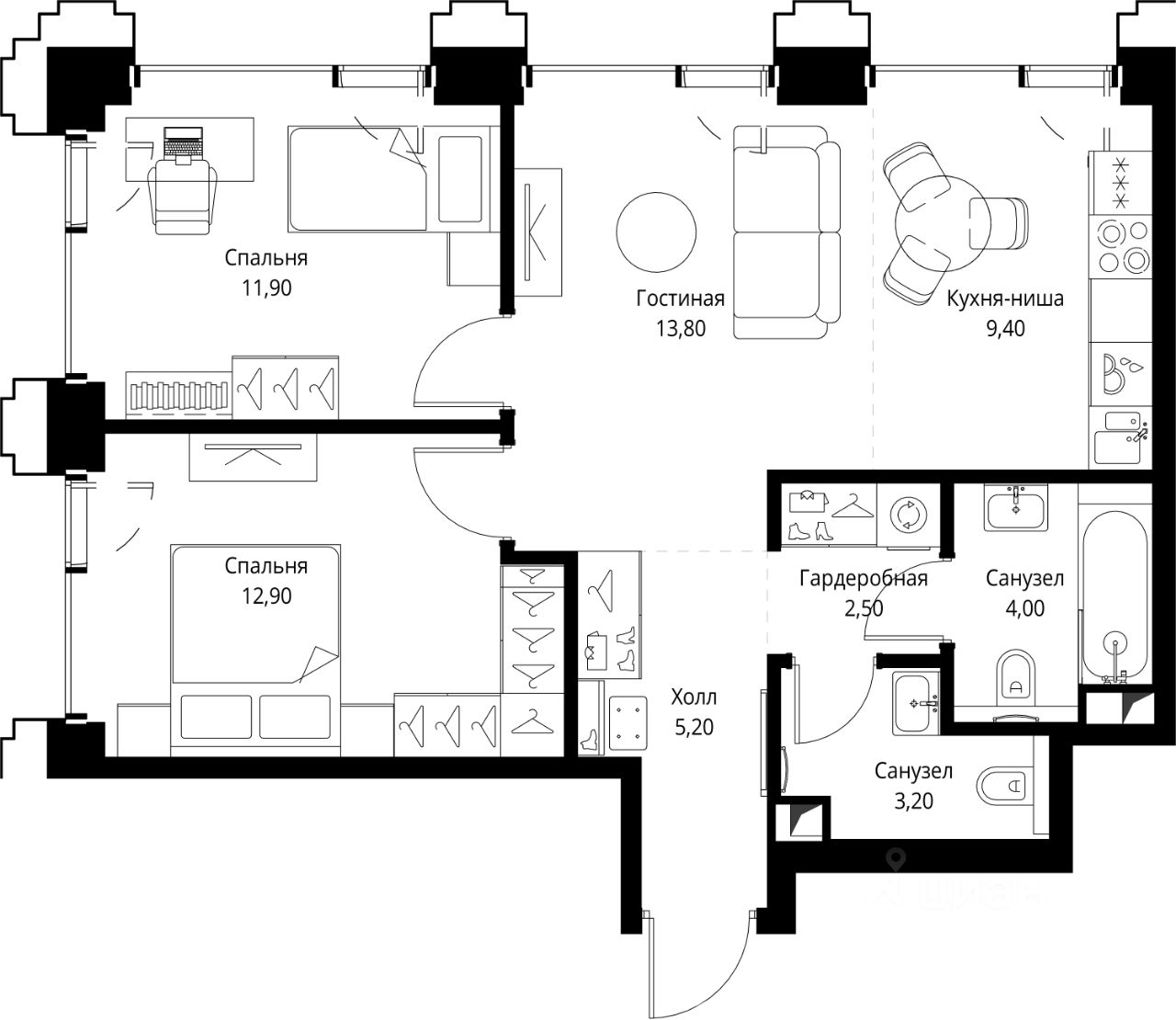 В ЖК SET продается 2-комнатная квартира площадью 62.90 м², расположенная в корпусе 3, на 11 этаже 45 этажного дома.