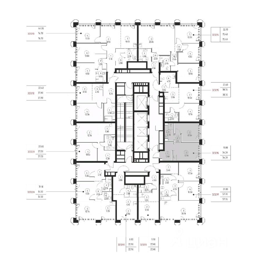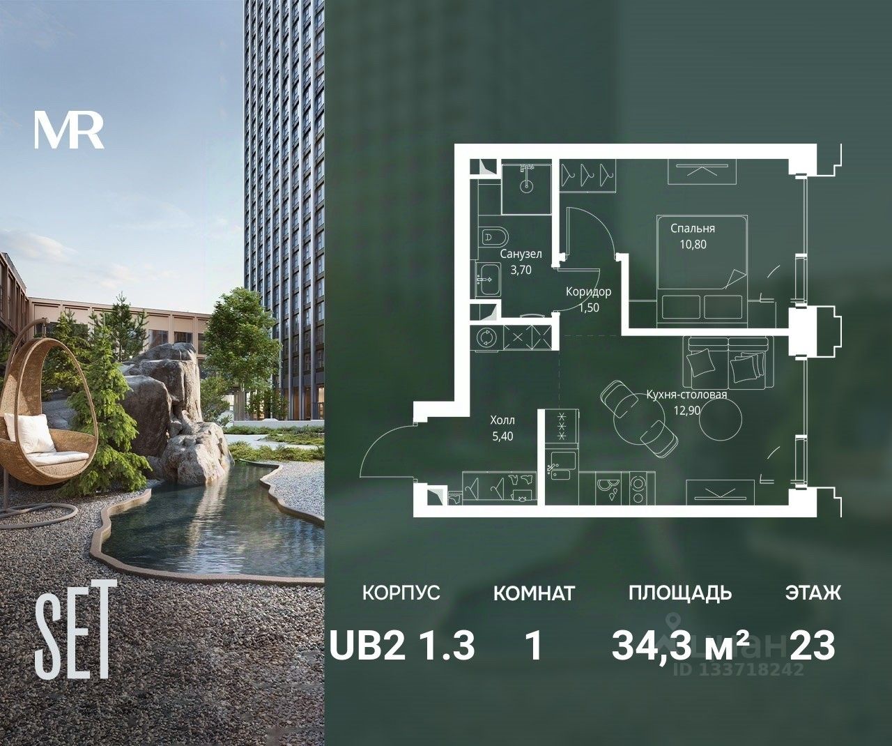 В ЖК SET продается 1-комнатная квартира площадью 34.30 м², расположенная в корпусе 3, на 23 этаже 45 этажного дома.